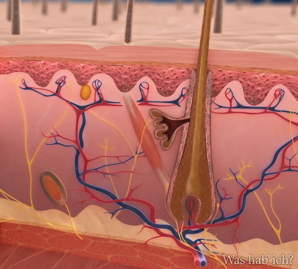 Die Haut ist das größte Organ des Körpers. Sie bildet die schützende Hülle vor Krankheitserregern und schädlicher UV-Strahlung. Die Haut hilft dabei, die Körpertemperatur und den Wasserhaushalt des Körpers zu steuern und vermittelt über verschiedene eingebaute Sinneszellen Information über die Umwelt. Die Haut besteht aus mehreren Schichten. Das sind die Oberhaut, die Lederhaut und die Unterhaut.